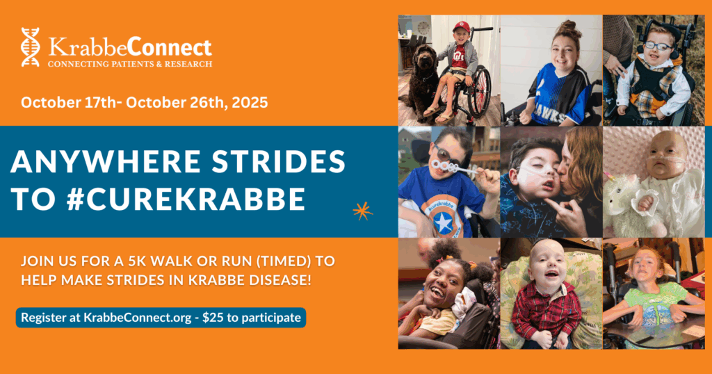 Join us for a meaningful journey towards a cure! Anywhere Strides invites you to lace up your sneakers and join our 5k walk or run, all in support to #curekrabbe.