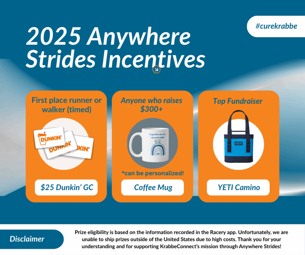 - Share your journey on social media using #AnywhereStrides2025 and #curekrabbe to inspire others to participate and spread awareness.