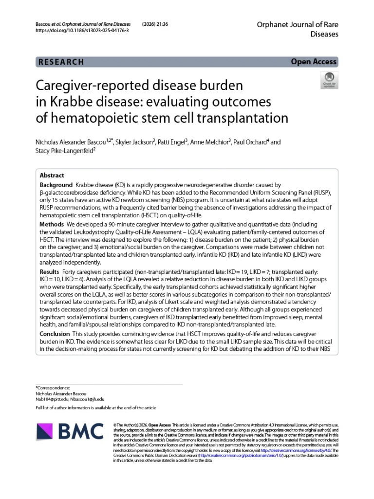 Caregiver-reported disease burden in Krabbe disease: evaluating outcomes of hematopoietic stem cell transplantation by Nicholas Alexander Bascou, Skyler Jackson, Patti Engel, Anne Melchior, Paul Orchard and Stacy Pike-Langenfeld.