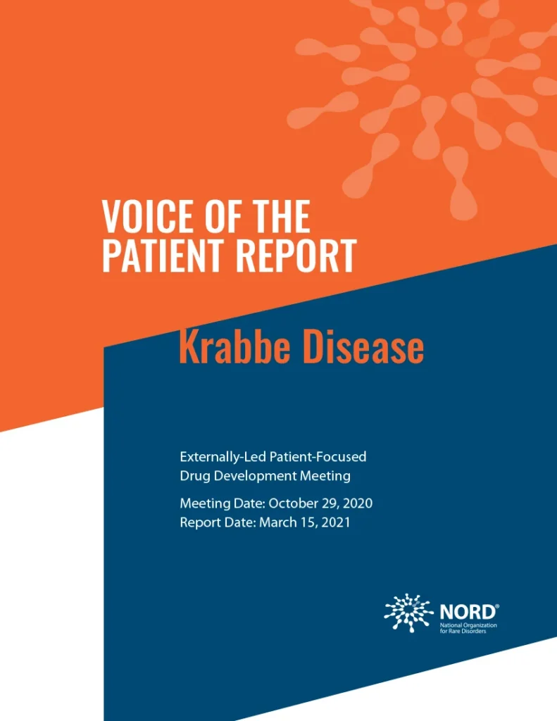 The National Organization on Rare Disorders, “Voice of the Patient Report: Krabbe disease.” 16 March 2021. This white paper covers the content voiced at the Externally Led-Patient Focused Drug Development meeting held on October 29th, 2020 with the Food and Drug Administration; a KrabbeConnect Initiative.
